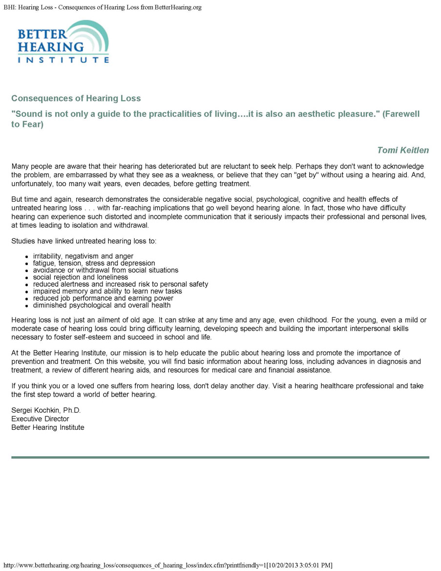 HEARING LOSS AFFECTS THE BRAIN - DO NOT PUT OFF GETTING HELP! AN EDUCATED, INFORMED CONSUMER YIELDS A SUCCESSFUL TREATMENT ARTICLE COURTESY OF BETTER HEARING INSTITUTE