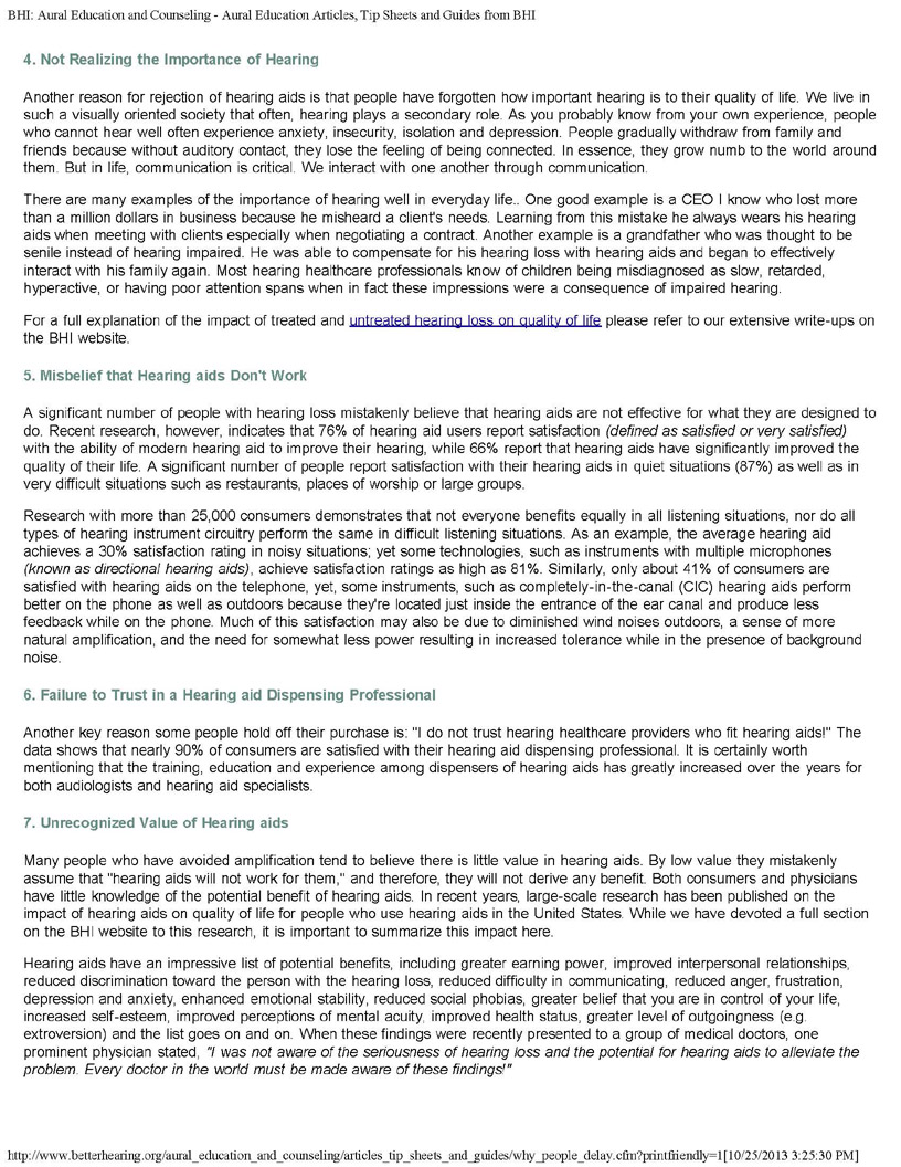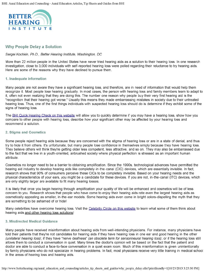 HEARING LOSS AFFECTS THE BRAIN - DO NOT PUT OFF GETTING HELP! AN EDUCATED, INFORMED CONSUMER YIELDS A SUCCESSFUL TREATMENT ARTICLE COURTESY OF BETTER HEARING INSTITUTE